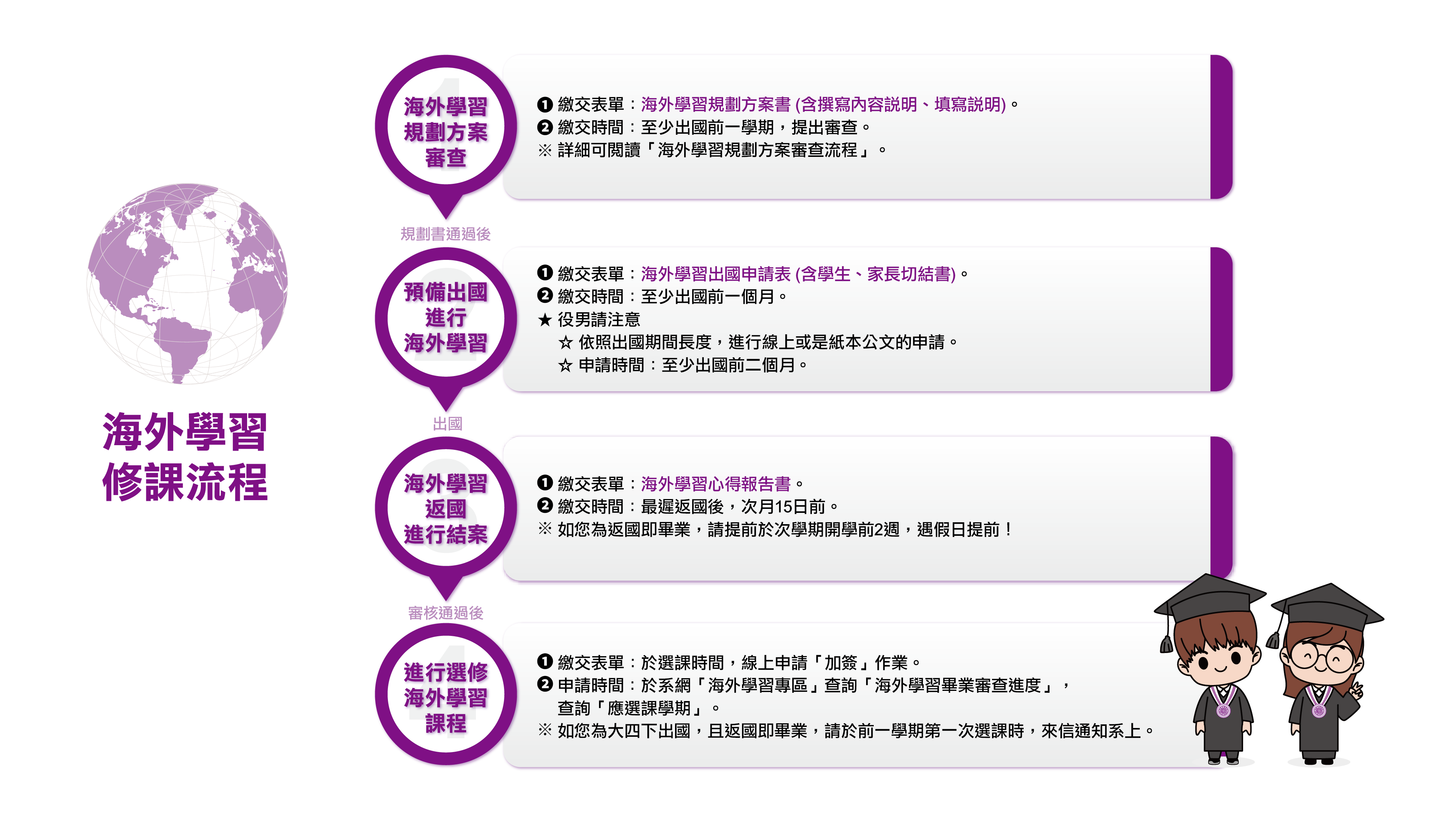 6. 學生須撰寫海外經驗規劃書並於學期開學第2-3週(上學期10月初;下學期3月初)繳交,規劃書得由導師確實輔導簽名才可受理。若審議不合格,學生須依照委員給予的回饋調整,並於12月或次年5月再向系上提出申請。